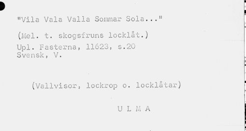 //// f L //// "Vila Vala Valla Sommar Sola...n //// (Mel. t. skogsfruns locklåt.) //// Upl. Fastorna, 11623, s.20 Svensk, V. //// (Vallvisor, lockrop o. locklåtar) f //// r //// U L M A ////