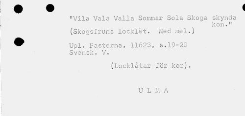 //// "Vila Vala Valla Sommar Sola Skoga skynda //// kon." //// (Skogsfruns locklåt. Med mel.) //// ^^ Upl. Fasterna, 11623, s.19-20 //// Svensk, V. //// (Locklåtar för kor). //// U L M A ////