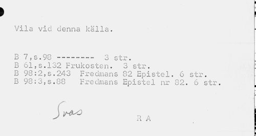 //// > i //// Vila vid denna källa. //// B 7?s.98--- 3 str. . //// B 61,s.132 Frukosten. 3 str. : B 98:2,s.243 Fredmans 82 Epistel. 6 str. //// B 98:3,s.88 Fredmans Epistel nr 82. 6 str. [ //// n n I ////