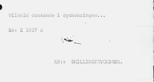 //// > Il //// Vilhelm dansande i syskonringen... Se: E 1827 u //// I //// KB: s SKILLINGTRYCKSREG. ////