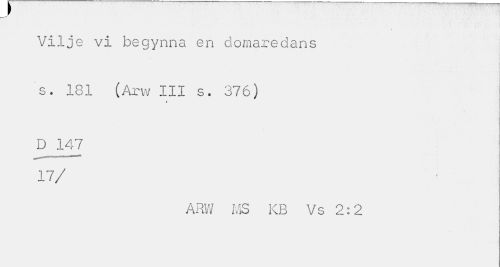 //// s //// Vilje vi begynna en domaredans //// s. 181 (Ar w III s. 376) //// * //// D 147 //// 17/ //// ARW MS KB Vs 2:2 ////