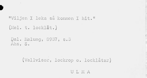 //// > //// nViljen I leka så kommen I hit." (Mel. t. locklat.) //// i //// k //// Dal. Malung, 8937, s.3 j //// Ahs, S. ' //// i //// i //// (Vallvisor, lockrop o. locklåtar) j //// i //// i \ //// U L M A ! //// i ////