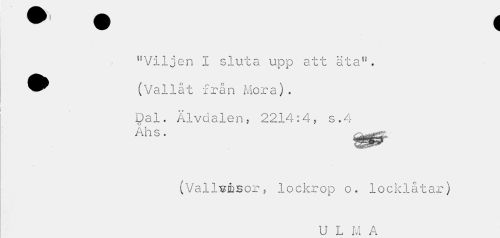 //// "Viljen I sluta upp att äta11. ^^ (Vallat från Mora). //// Dal. Älvdalen, 2214:4, s.4 //// (Vall^msor, lockrop o. locklåtar) //// U L M A ////
