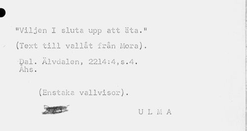 //// > //// "Viljen I sluta upp att äta." //// (Text till vallåt från Mora). [ //// ( //// Dal. Älvdalen , 2214:4, s. 4. //// o f ' //// Ah s. //// (Enstaka vallvisor). ////