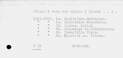 //// Viljen I veta och viljen I förstå . . 3 . //// - . Lekt.1941. La. Arvidsjaur,Auktsjaur. //// tf " La. Vilhelmina Skansholm. //// " " Nä. Örebro, (alla) //// n M Sk. Glimminge sn.Glimmingeby. //// 11 n Sk. Tomme lilla Try d e . //// 11 n Sm. Ejorteds sn. Totebo. //// ^ D 65 NORD.MUS. ////