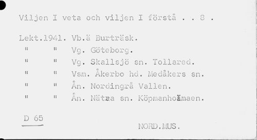 //// Viljen I veta och viljen I förstå . . 8 . j //// Lekt.1941. Vb.ä Burträsk. //// i //// 11 15 Vg. Göteborg. //// n u Vg. Skallsjö sn. Tollared. //// 11 11 Vsrn. Åkerbo hd. Medåkers sn. //// !f n Ån. Nordingrå Vallen. //// o //// n " An. Nätaa sn. Köpmanholmaen. D 65 //// *---NORD.MUS. ////