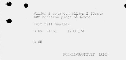 //// • • i //// Viljen I veta och viljen I förstå hur bönderna pläga så havre //// Text till danslek //// S.Ny. Verml. 1738:174 //// D 65 ~... ¦ — //// FOLKLIVSARKIVET LUND ////