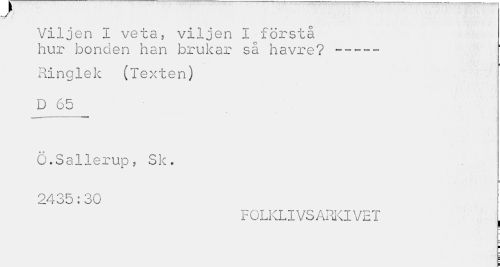 //// / //// Viljen I veta, viljen I förstå //// hur bonden han brukar så havre? --- //// Ringlek (Te xten) D 65 //// b f //// O.Sallerup, Sk. 2435:30 //// FOLKLIVSARKIVET , //// ¦ ////