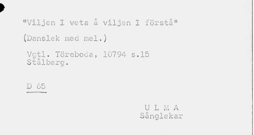 //// r //// "Viljen I veta å viljen 1 förstå11 //// (Danslek med mel.) //// Vgtl. Töreboda, 10794 s.15 Stålberg. //// D 65 //// U L M A //// Sånglekar ////