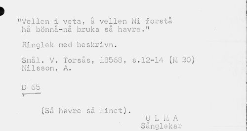 //// t //// "Velien I veta. å velien Ni förstå hå bönnå-nå bruka så havre." //// Ringlek med beskrivn. //// Smål. V. Torsås, 13568, s.12-14 (M 30) ; //// Nilsson, A. //// D 65 //// (Så havre så linet). //// U L M A Sånglekar ////
