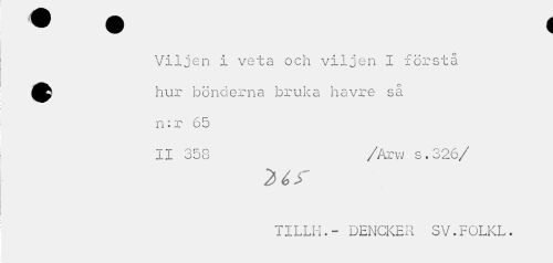 //// Viljen i veta och viljen I förstå ^fe hur bönderna bruka havre så //// n: r 65 //// II 358 /Arw s.326/ //// TILLH.- DENCKER SV.F OLKL. ////
