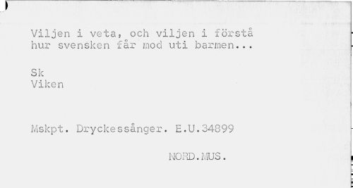 //// f //// Viljen i veta, och viljen i förstå hur svensken får rnoö uti barmen. . . //// Sk //// Viken //// Mskpt. Dryckessånger. E.U.34899 //// NORD.MUS. I //// ¦ ////