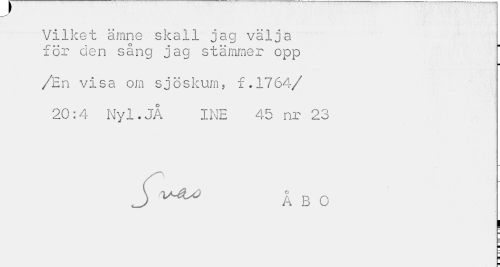 //// y //// Vilket ämne skall jag välja för den sång jag stämmer opp //// /En visa om sjöskum, f.1764/ //// 20:4 Nyl.JÅ INE 45 nr 23 //// J> ^ ÅBO //// i ¦ ////