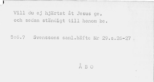 //// Vill du ej hjärtat åt Jesus ge, //// och sedan ständigt till honom be. //// ? //// 5:6.? Svenssons saml.häfte Nr 29.s.26-27 , //// ÅBO //// » ////