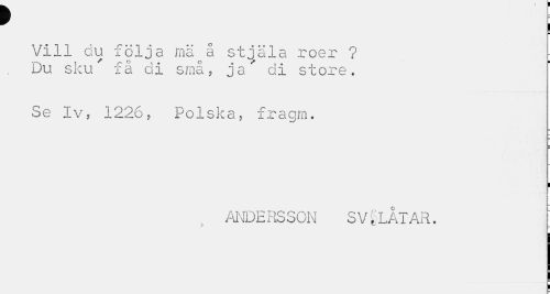 //// w //// m //// Vill du följa mä å stjäla roer ? Du sku få di små, ja" di store. //// Se Iv, 1226, Polska, fragm. //// i //// ANDERSSON SVtLAXAR. ; ////