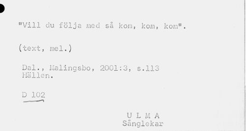 //// 9 //// tfVill du följa med så korn, kom, kom", (text, mel.) //// Dal., Malingsbo, 2001:3, s.113 Pia lien. //// D 102 //// U L M A //// Sånglekar ////