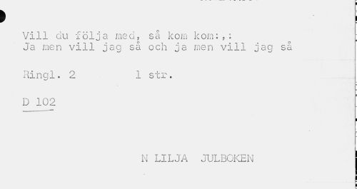 //// > ! //// Vill du följa med, så kom kom:,: ; //// Ja men vill jag så och ja men vill jag så //// Ringl. 2 1 str. //// D 102 ! //// i //// v _ //// N LILJA JULBOKEN //// / ////