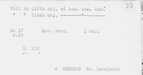 //// Vill du gifta dej, så kom,- kom, kom.' 11 n älska mej, — „„ f //// Nr 17 End. text. 1 str. //// s.10 //// i //// D 102 //// ^r-- //// i //// A YSENIUS Sv. Danslekar i ////