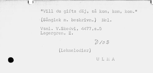 //// "Vill du gifta däj, så kom, kom, kom." //// (Sånglek m. beskrivn.) Mel. //// Vsml. V.Skedvi, 4477,s.5 Lagergren, E. ////