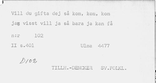//// Vill du gifta dej så kom, kom, kom ja§ visst vill ja så bara ja kan få //// n:r 102 //// II s.401 Ulma 4477 //// J)/01s //// TILLH.-DENCKER SV.FOLKL. //// j ¦ ////