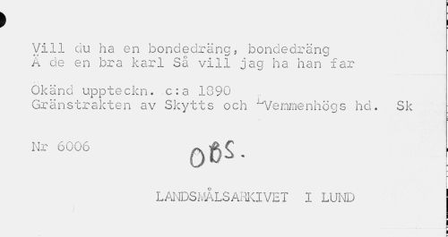 //// > i //// Vill du ha en bondedräng, bondedräng A de en bra karl Så vill jag ha han far //// Okänd uppteckn. c:a 1890 //// Gränstrakten av Skytts och Vemmenhögs hd. Sk Nr 6006 //// L ANDSMALSARKIVE T I LUND ////