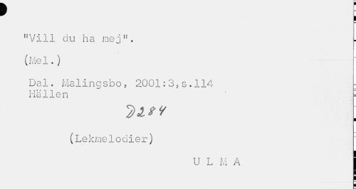 //// i //// "Vill du ha mej". //// / //// (Me1. ) //// Dal. Malingsbo , 2001:3,s.114 : //// Hällen ' ¦ //// (Lekmelodier) : //// U L M A I ////