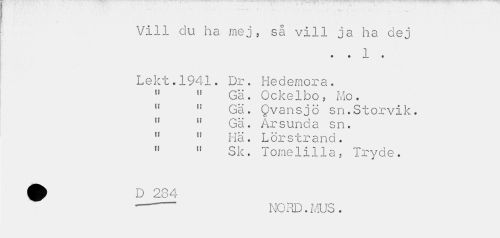 //// s. • . • - - \ . - . B //// Vill du ha mejs så vill ja ha dej //// • • 1 # //// Lekt.1941. Dr. Hedemora. //// " " Gä. Ockelbo, Mo. //// " n Gä. Qvansjö sn.Storvik. //// " u Gä. Arsunda sn. //// n n Hä. Lörstrand. //// n " Sk. Tomelilla, Iryde. //// ^ ---NORD. MUS . ////