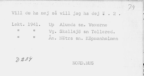 //// • 7 "'*¦ ... *¦ //// Vill du ha mej så vill jag ha dej a . 2 . //// i //// Lekt. 1941. Up Alunda sn. Voxorne //// " Vg. Skallsjö sn Tollered. //// O //// H fr An. Nätra sn. Köpmanholmen //// » //// - //// NORD.MUS [ //// = //// ¦ ////