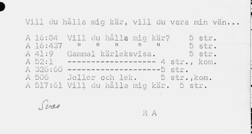 //// f //// I //// Vill du hålla mig kär, vill du vara min vän... //// i //// A 16:84 Vill du hålla mig kär? 5 str. A 16:437 51 » 51 » « 5 str. //// A 41:9 Gammal kärleksvisa. 5 str. //// A 52:1 ---4 str., korn. //// A 326:60 ---5 str. //// A 506 Joller och lek. 5 str.,korn. A 517:61 Vill du hålla mig kär. 5 str. //// St^u //// R A ////