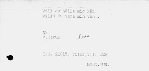 //// . . . • //// * r* • * ¦* , , - t- " //// Vill du hålla mig kär, villd du vara min vän... //// •S le //// V.Karup j v** //// E.U. 22015. Visor,V.s. 329 //// NORD. MUS. ////