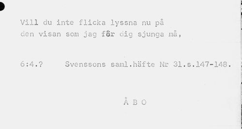 //// r //// ! //// Vill du inte flicka lyssna nu på //// i //// den visan som jag for dig sjunga må5 //// 6:4.? Svenssons saml.häfte Nr 31.s.147-148. //// i i //// Å B O ////