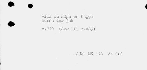 //// Vill du köpa en bagge ^^ hörna tar jak //// s.349 (Arw III s.439) //// . ARW MS KB Vs 2:2 ////