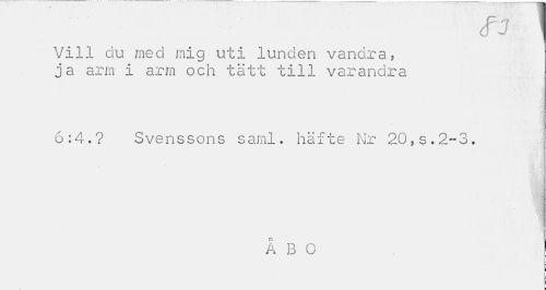 //// y //// Vill du med mig uti lunden vandra, ja arm i arm och tätt till varandra //// 6:4.? Svenssons saml. häfte Nr 20,s.2-3. //// ÅBO ////