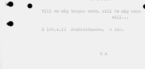 //// Vill du mig trogen vara, vill du mig vara //// S Cv JL i • * • //// B 104,s.13 Avskedstunden. 6 str. //// R A ////