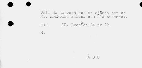 //// m « i //// Vill du nu veta hur en sjöman ser ut Med mörkblåa kläder och blå sidenduk. //// 9 4:4. PE. Brage/s.34 nr 29. //// N. //// ÅBO ////