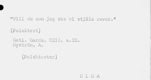 //// > //// "Vill du som jag ska vi stjäla rovor.11 (Polsktext) //// Gotl. Garea.? 8213, s.32. ; //// Nyström, A. //// (Polsktexter) //// 1 j //// i i //// i //// U L M A ////