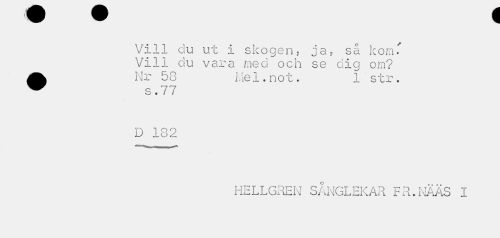 //// Vill du ut i skogen, ja, så kom.' Vill du vara med och se dig om? ' ^ Nr 53 Mel.not. 1 str. //// D 182 //// > //// KELLGREN SÅNGLEKAR FR.NÄÄS I ////