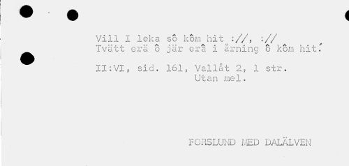 //// Vill I leka so kom hit ://, :// ^^ Tvätt erä o jär era i årning 6 kom hit T //// II:VI, sid. 161, Vallat 2, 1 str. //// Utan mel. //// FORSLUND MED DALÄLVEN ////