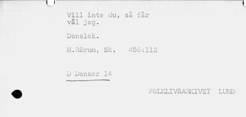 //// Vill inte du, så får väl jag. //// Danslek. //// N.Rörum, Sk. 456:112 D Danser 14 //// A FGLKLIVSARKIVET LUND ////