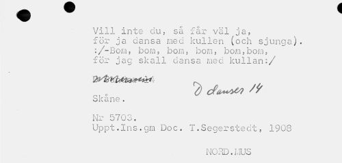 //// Vill inte du, så får väl ja, för ja dansa med kullen (och sjunga). :/-Bom, bom, bom, bom, bom,bom, för jag skall dansa med kullan:/ //// d cfa^? //// Skåne. Nr 5703. //// Uppt.Ins.gm Doc. T.Segerstedt, 1908 //// NORD.HUS ////