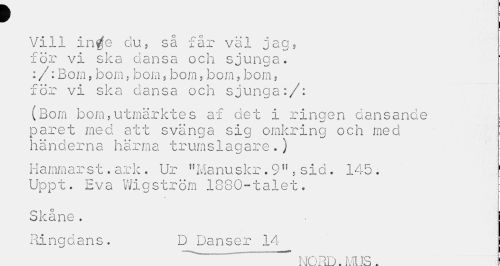 //// 9 //// Vill in$e du, så får väl jag, för vi ska dansa och sjunga. :/:Bom,bom,bom,bom,bom,bom, för vi ska dansa och sjunga:/: //// (Bom bom,utmärktes af det i ringen dansande paret med att svänga sig omkring och med händerna härma trumslagare.) //// Hammar st. ark. Ur 11 Ma nu skr. 9fl, sid. 145. Uppt. Eva Wigström 1880-talet. //// n i ° //// Skåne. //// Ringdans. D Danser 14 //// ...NORD. MlJS. i ////