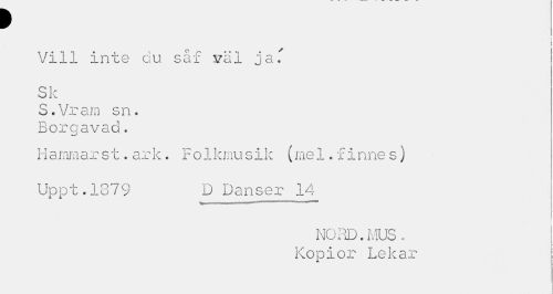 //// f //// t I //// *T T * 1 * I "i O <->. e «? e ^ //// Vill inte o;u sax val ja. Sk //// S.Vram sn. Borgavad. //// Hammarst.ark. Folkmusik (mel.finnes) Uppt.1879 D Danser 14 //// NORD. MUS. Kopior Lekar ////