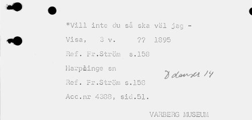 //// "Vill inte du så ska väl jag -Visa, 3 v. ?? 1895 Re x . i- r. btr om s . 158 Harp&inge sn Ref. Fr.Ström s.158 Acc.nr 4388? slö.51. //// VARBERG MUSEUM ////