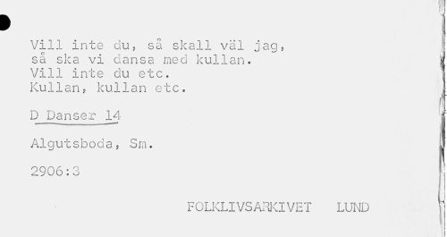 //// I 1 //// Vill inte du, så skall väl jag, //// så ska vi dansa med kullan. | //// Vill inte du etc. 1 //// Kullan, kullan etc. \ //// f //// D Danser 14 | //// Algutsboda, Sm. J //// 2906:3 |j //// FOLKLIVSARKIVET LUND p ////