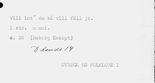 //// f //// m //// Vill int' du så vill fäll ja. 1 str. m mel. //// s. 26 (Moberg Exerpt) : //// DYBECK MS FOLKLORE 1 ////