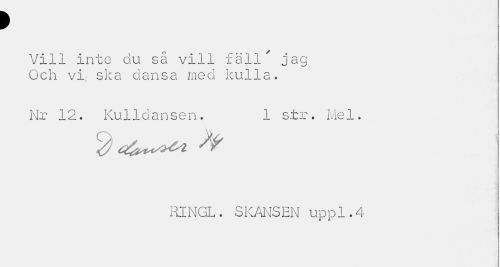 //// > //// Vill inte du så vill fäll' jag Och vi: ska dansa med kulla. //// Nr 12. Kulldansen. 1 str. Mel. //// RIMGL. SKANSEN upp1.4 ////