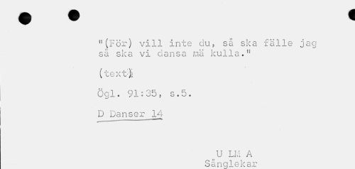 //// "(För) vill inte du, så ska fälle jag så ska vi dansa raä kulla." //// (text-i //// ögl. 91:35, s.5. D Danser__14 //// oU LM Å //// Sånglekar ////
