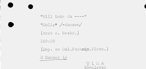 //// "Vill inte du ^ "Kulla0 /-dansen/ //// (text o. beskr.) //// 169:39 //// (Dep. av Dal .Fornisqn. f ören.) D Danser 14 //// U L M A //// Sånglekar ////