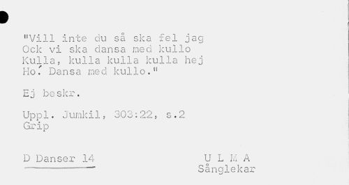 //// > //// ¦j //// "Vill inte cäu så ska fel jag Ock vi ska dansa med kullo Kulla, kulla kulla kulla hej Ho.' Dansa med kullo." //// i //// Ej beskr. //// Uppl. Jumkil, 303:22, s.2 Gr i p //// D Danser 14 U L M A ---Sånglekar ////