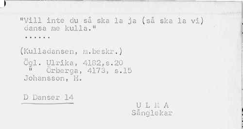 //// "Vill inte du så ska la ja (så ska la vi) dansa me kulla." //// (Kulladansen, m.beskr.) //// Ögl. Ulrika, 4182,s.20 //// " Örberga, 4173, s.15 Johansson, H. //// D Danser 14 //// ---—' U L M A . //// Sånglekar ! //// i //// ¦ ////